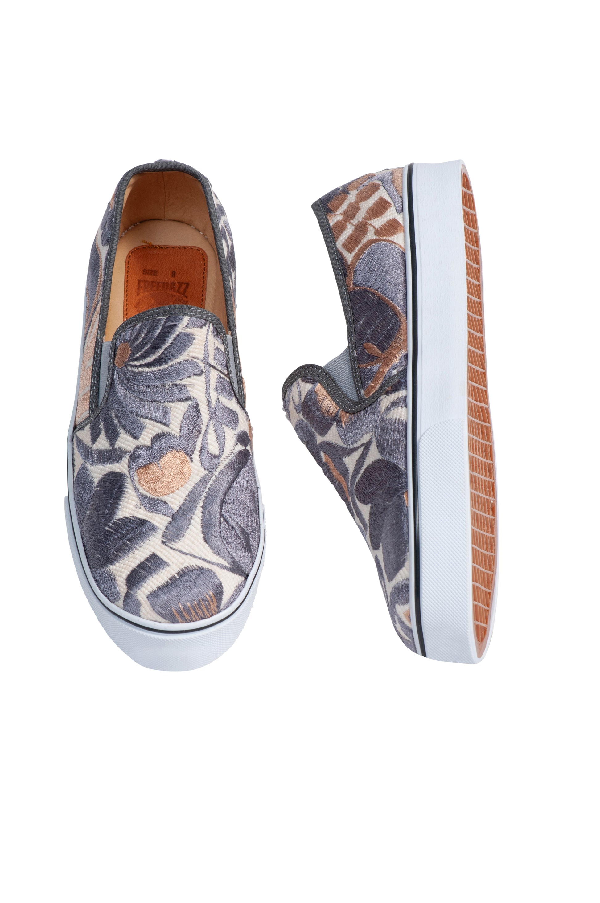 The love child of neutrals meets whimsy, our popular Westport Loafer blends embroidered gray and camel florals against an off-white background. Elastics on the upper with cushy padding provides easy on/off, even for wide feet. 1" sole has ample arch support.